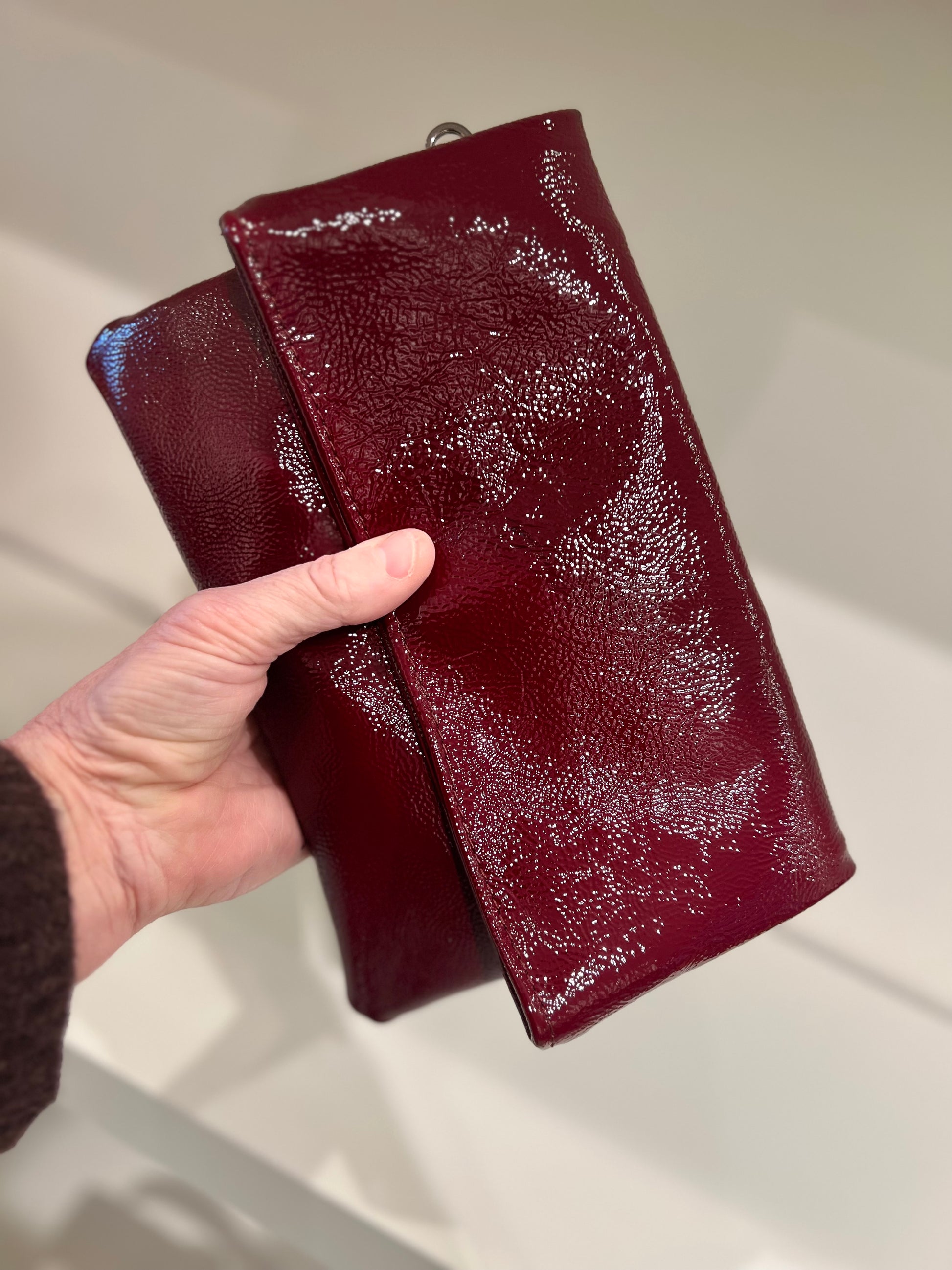- Clean with a damp (not moist!) cloth to remove invisible dust, dirt, pollution, etc. If there are no visible spots left, this should suffice. For your lacquered bag you can use a dry cloth.