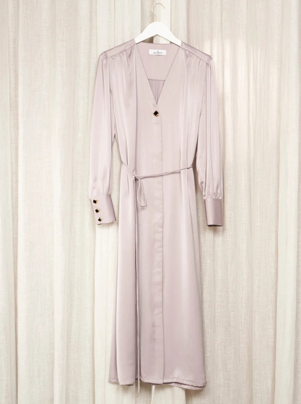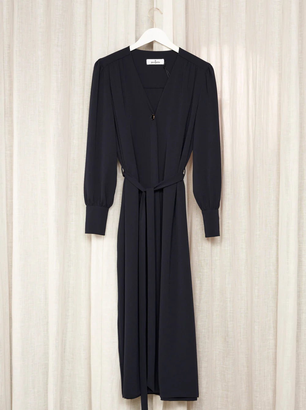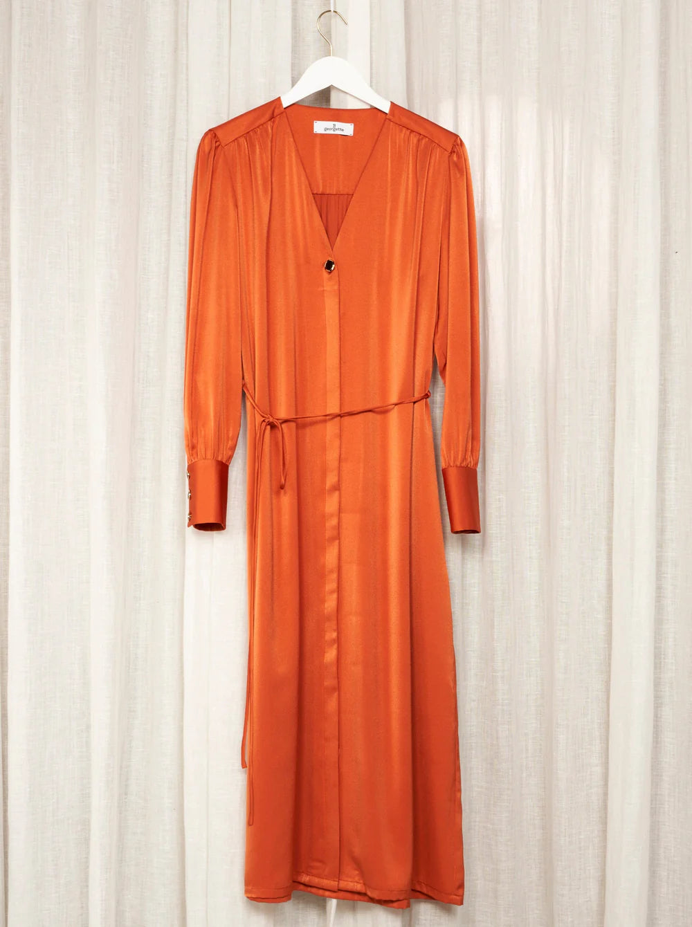 V-neckline, long dress with oversized shoulders. Single round black and gold front button. Sleeve cuff with 3 small black and gold buttons. 2 hip pockets on either side of the dress. Silk-feel fabric and knotted belt. Machine wash on delicate programme.