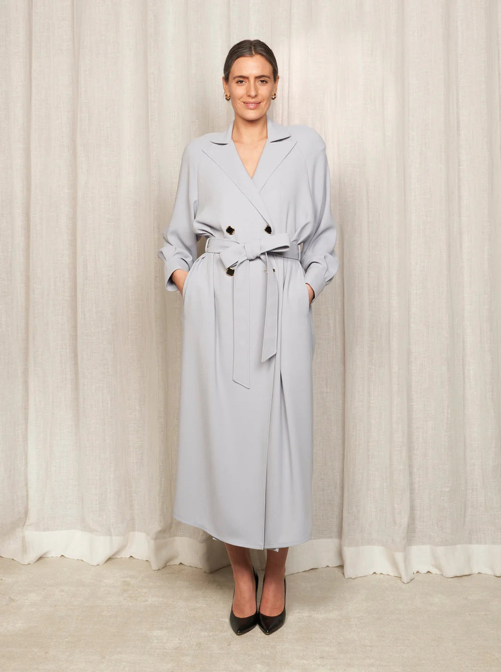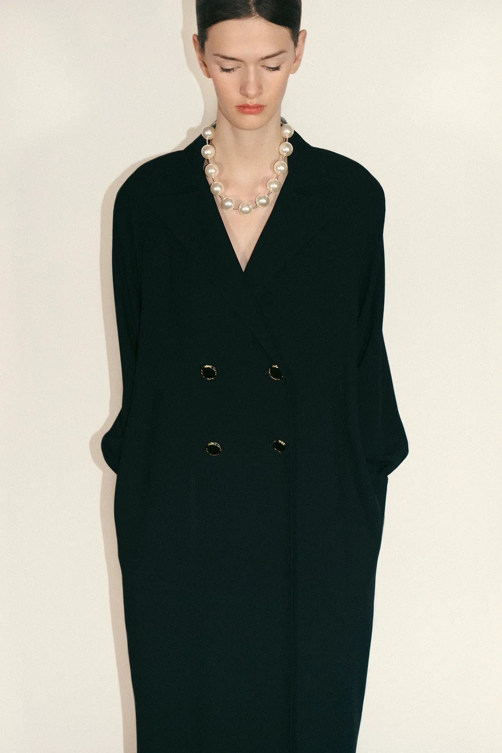 Long dress with blazer collar, and oversized shoulders to be worn as a dress or a trench coat. 4 round black and gold front buttons. Knotted belt. 2 hip pockets on either side of the dress. Machine wash on delicate programme.