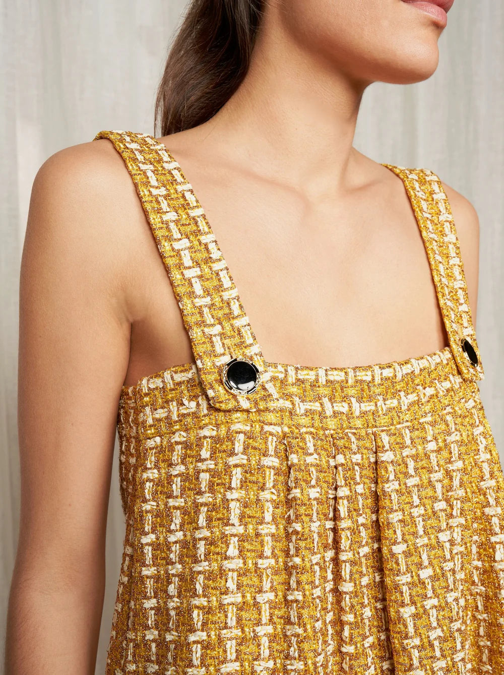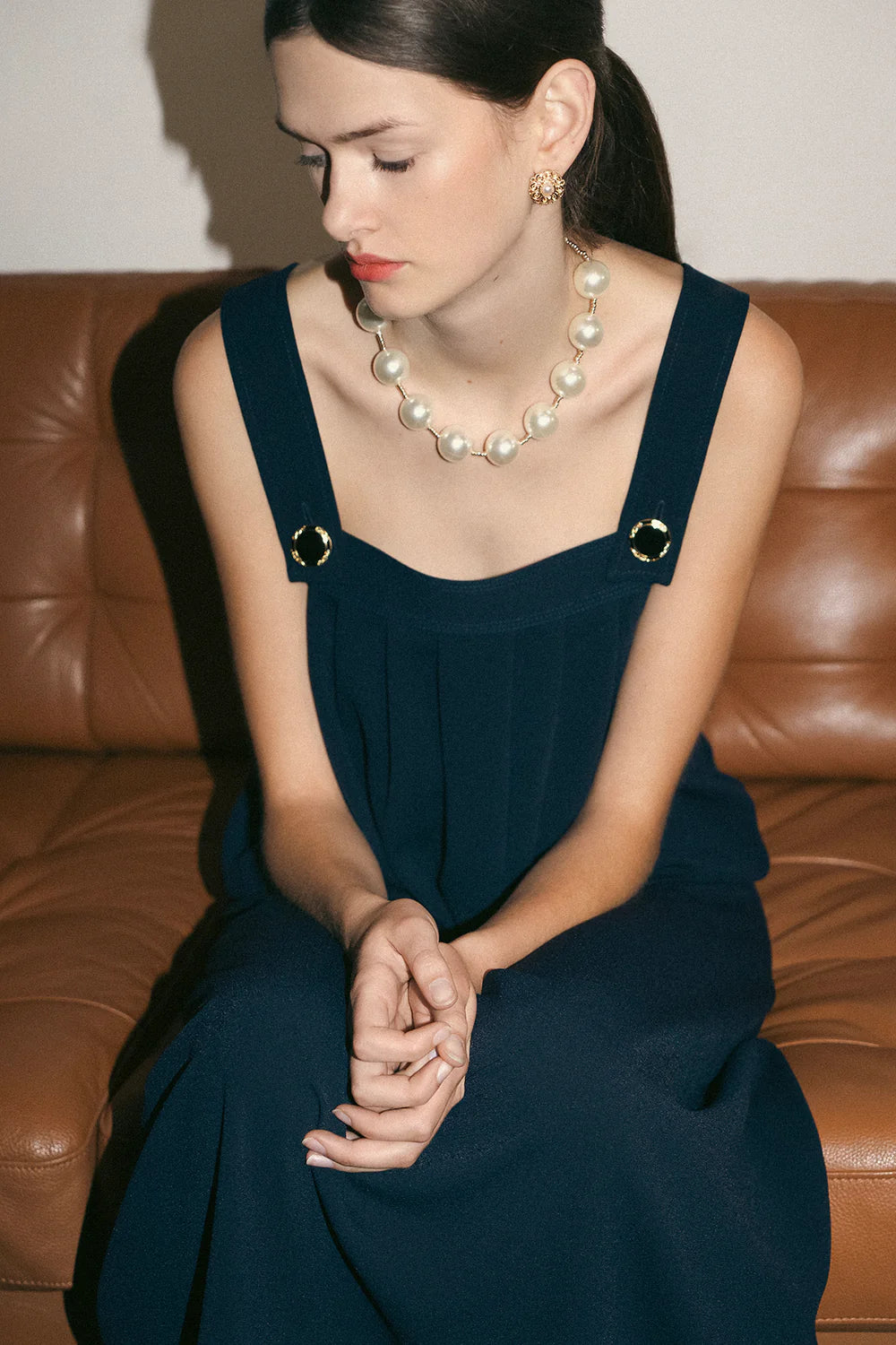 Long dress with 2 straps and buttons. Front band and elasticated back for ideal comfort. Inside gold stitching. Soft crepe-feel fabric. Machine wash on delicate programme.