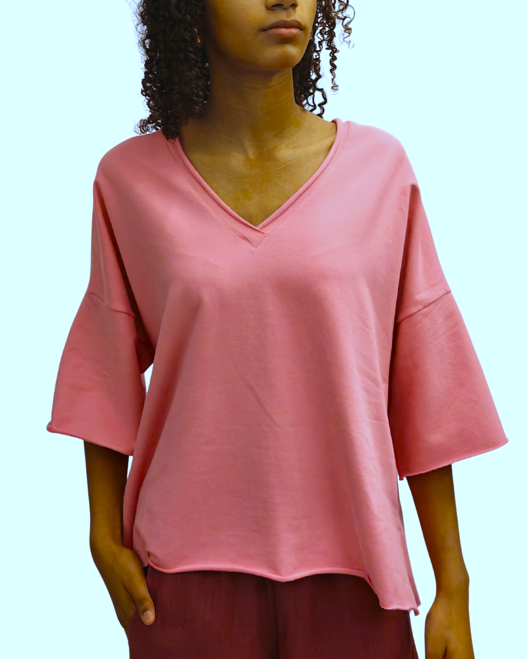 De Gloria Top is een speels en karaktervol ontwerp met een uitgesproken, bewust onafgewerkte diepe V-hals. De korte, brede mouwen met lage inzet geven de top een unieke vorm en een subtiele nonchalance, zonder aan verfijning in te boeten. Gemaakt uit uitzonderlijk zachte, gebrushte soft sweat, wat zorgt voor een comfortabel en luxueus draaggevoel. Uitgevoerd in roze en vervaardigd uit GOTS-gecertificeerd biologisch katoen. Een onderscheidend stuk dat zachtheid en karakter samenbrengt — typisch JNSQ. Materiaal:GOTS-gecertificeerde soft sweat