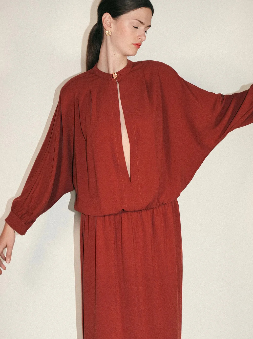 Long dress with round knotted collar, and bat sleeves. 1 round powder pink front button. Large neckline on the front. Elasticated waist. Soft crepe-feel fabric. Machine wash on delicate programme.